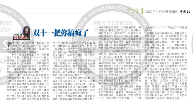 淘宝购物,平时满¥299就能包邮到新加坡。在双十节,还有满20减10元的消费券。平台上,各商家也大张旗鼓,挂上大打折的旗帜。商品真如商家所标示的那样实惠吗?举例我购物车里的一个面包模具吧,平日售价二十五元新币,到了双十一,商家把价格抬高至三十,再减至二十,假若本已执意购买此物,那双十节下单自然划算,只怕原本三心两意,或勿须购买的商品,在大打折的鼓吹下,煽动了贪图便宜的心理,一举买下海量的无用货品,是物资的浪费呢,也破坏地球资源。打开Youtube视频,就能见到好些Youtuber一边淘宝拆箱,一边说自己早就忘了曾下单这样、那样货品,可见其不重要性,非常显著。此外,不乏挂着“断舍离”名堂,实则扭曲了其原意的Youtuber,仅仅因为平日极其奢侈地购物,才落下一堆动也没动过、碰也没碰过的商品,堆积家中。